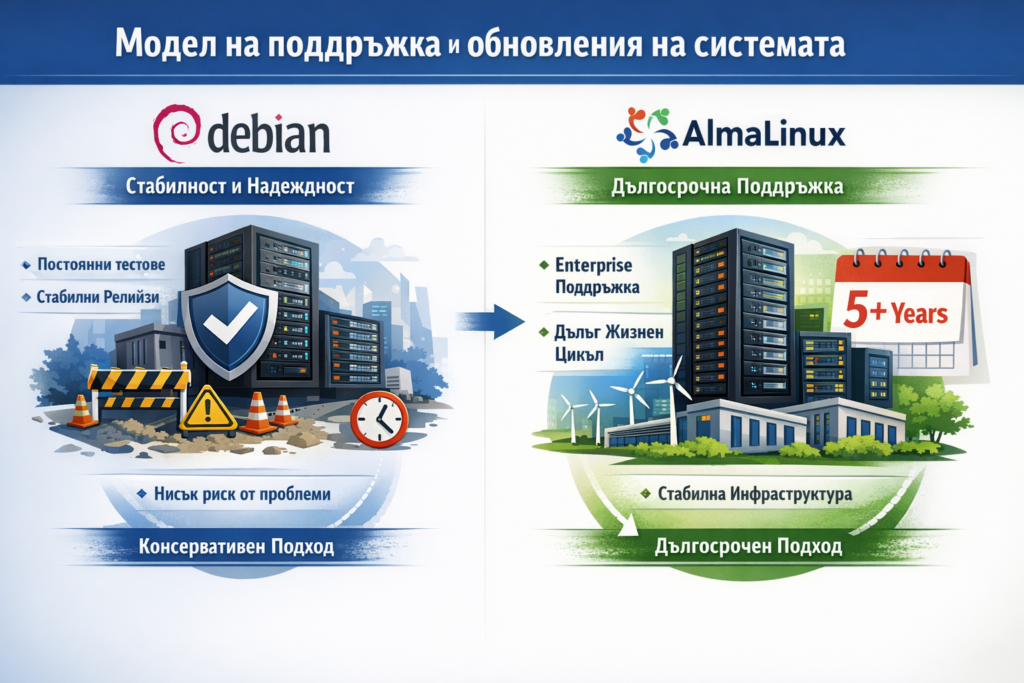 Друг важен фактор е начинът, по който се поддържа и обновява операционната система. Различните Linux дистрибуции следват различни модели на издаване и поддръжка. Debian използва консервативен модел на обновления, при който стабилността на системата е основен приоритет. Новите версии се пускат след продължително тестване, което намалява риска от проблеми при работа на сървъра. AlmaLinux следва модела на enterprise Linux системите и предлага дългосрочна поддръжка на версиите, което го прави подходящ за инфраструктури, които трябва да работят стабилно дълги години.