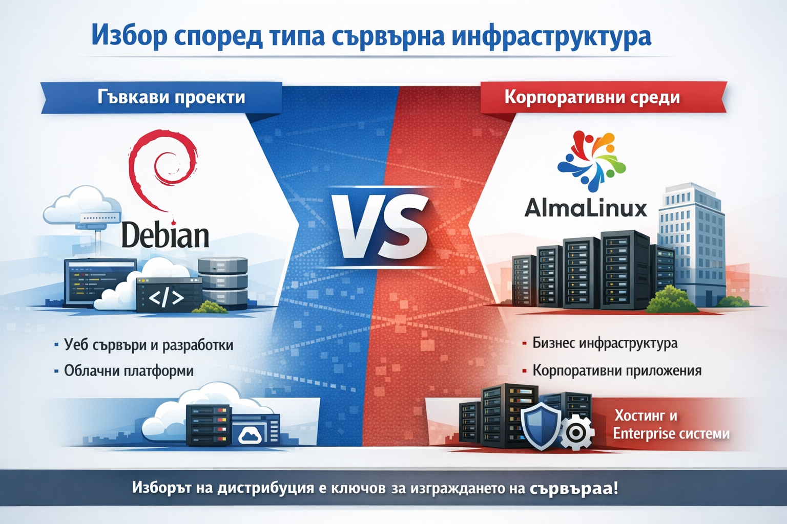Debian носи стабилност, гъвкавост и open-source дух, който е идеален за уеб услуги и VPS среди. AlmaLinux предлага предвидимост, enterprise стабилност и лесно управление в корпоративни среди.